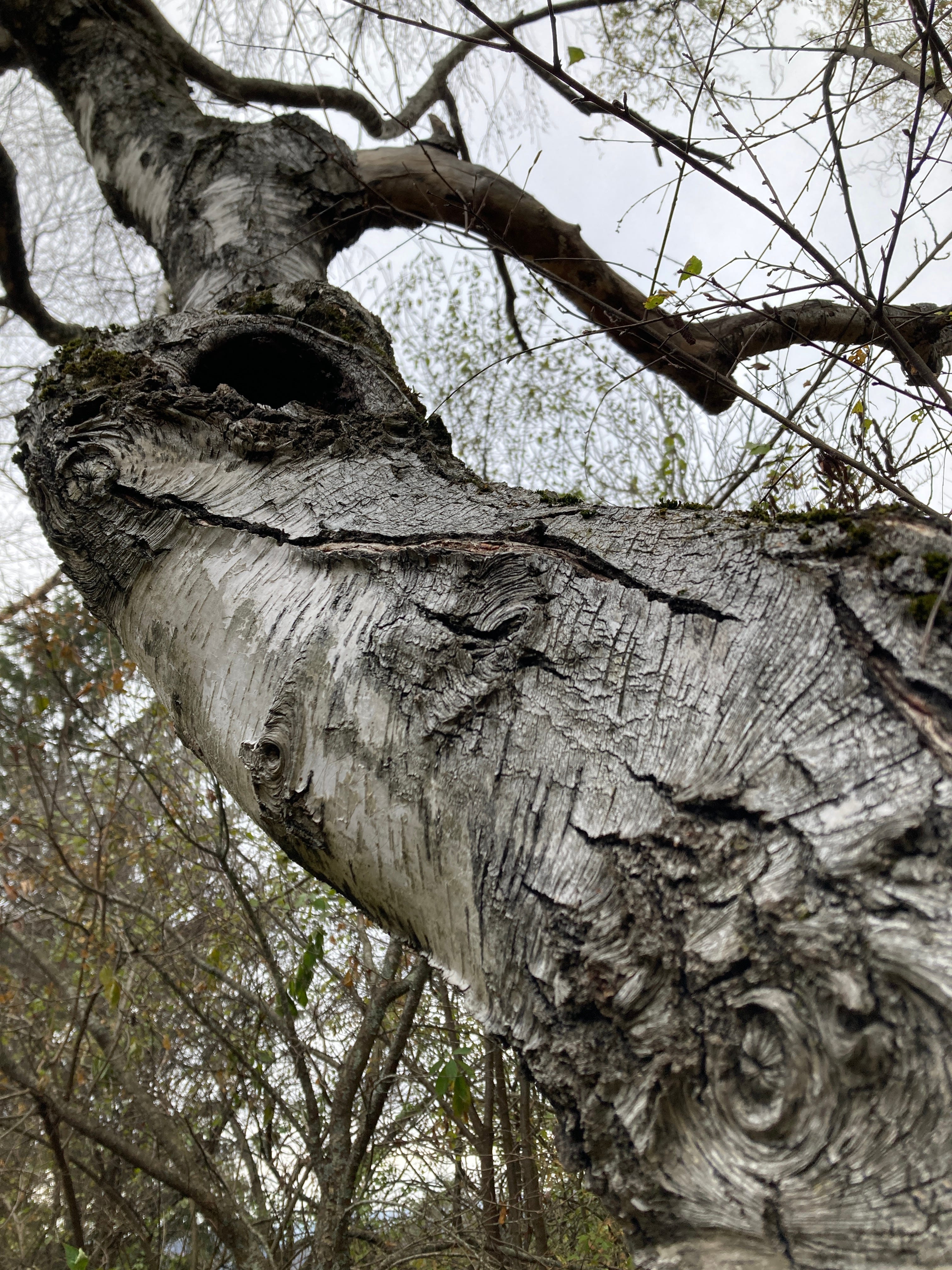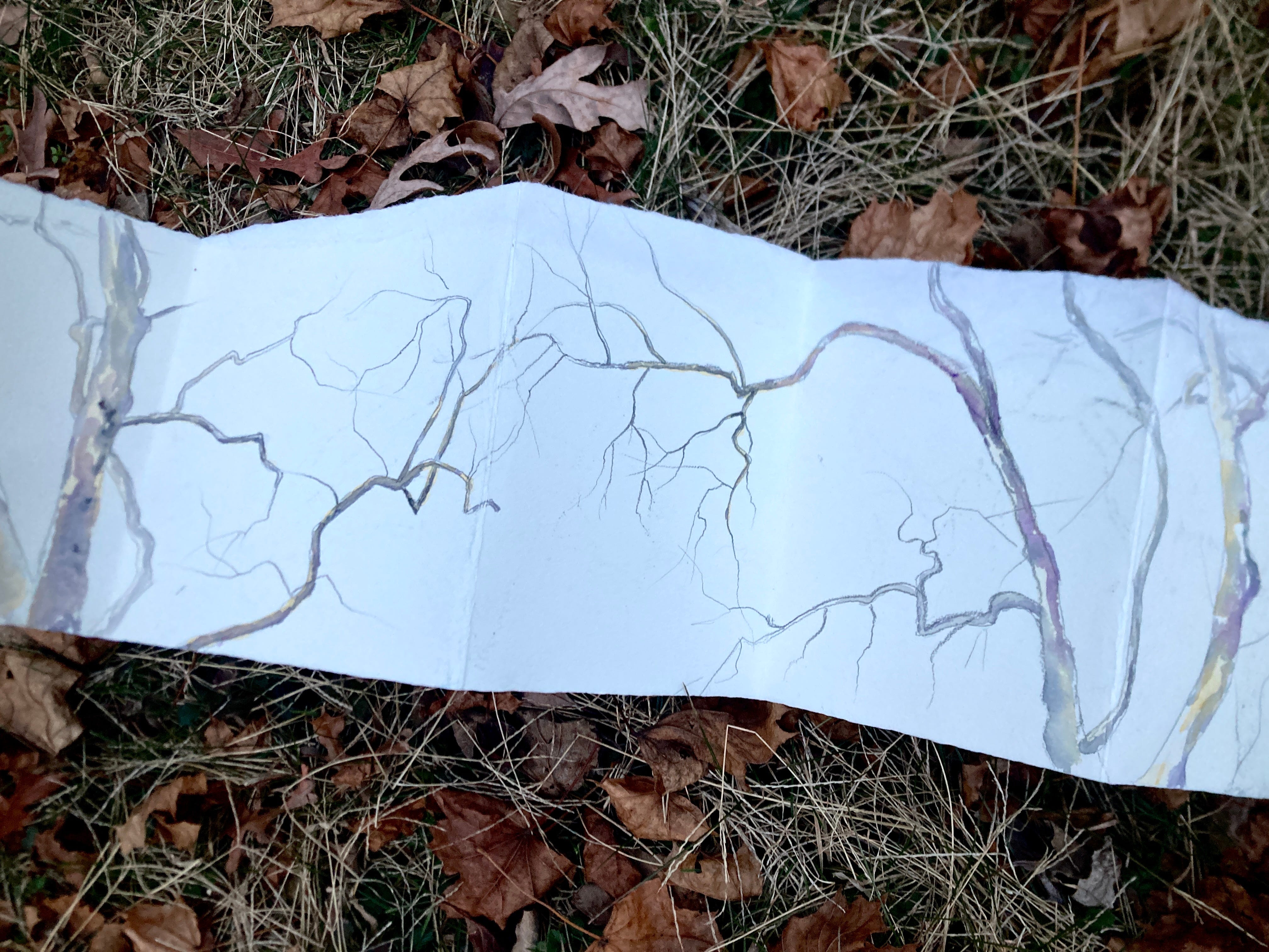 Like many tree watchers, I often perceive gestures in tree trunks and limbs. That day, I chose to focus my drawing not on a single tree, or even a part of one—what I call a “tree moment”—as usual, but rather on the connection between two beautiful sycamore trees that I imagined were caught in a sort of dance, bending, stretching, reaching toward one another. Could I capture that gesture, that relationship? Not necessarily the trees themselves, but the feeling of them, and the feeling of being near them.