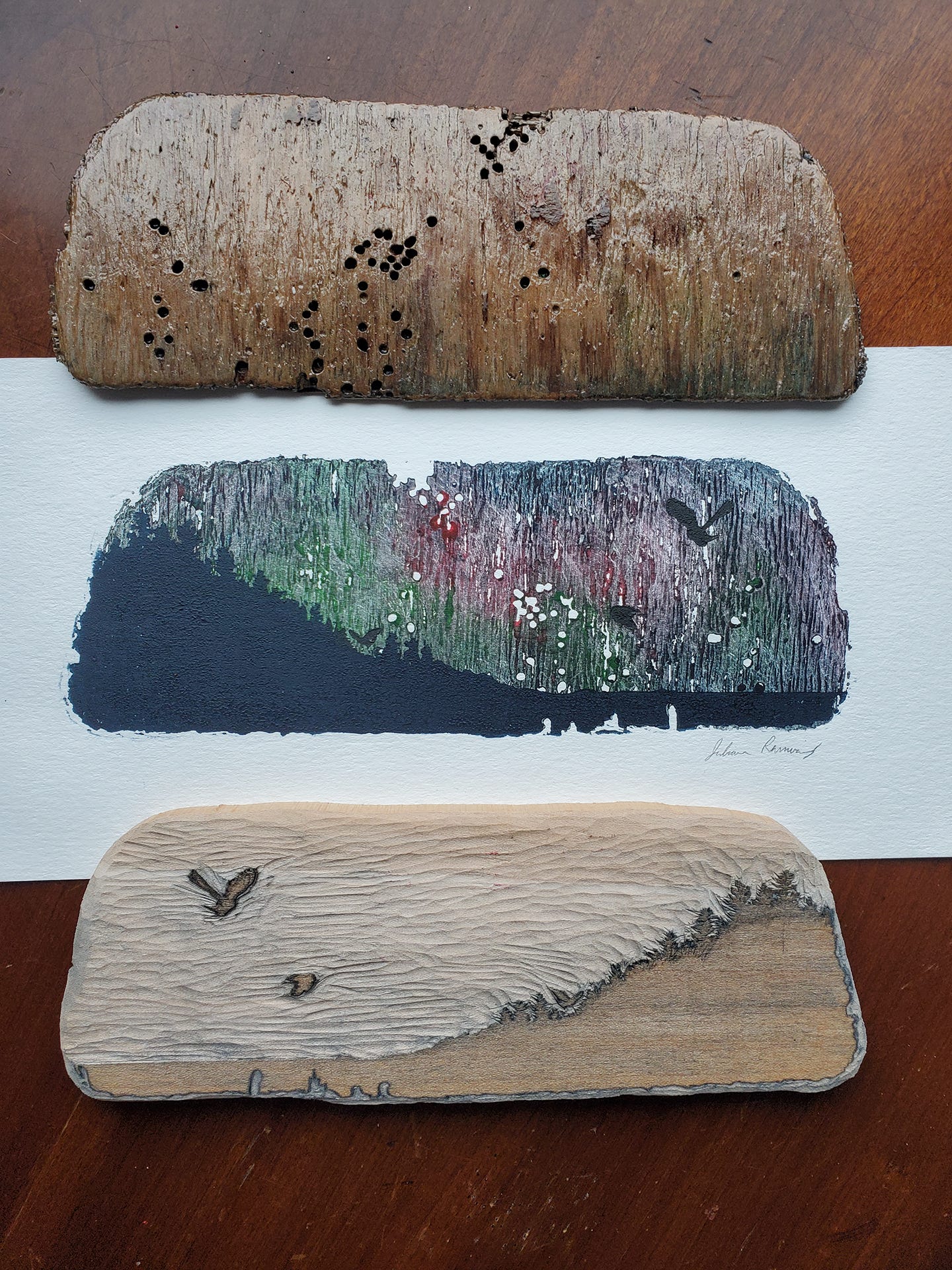 With so many techniques within printmaking, I try my best to be environmentally conscious and end up choosing methods based on potential impact. I gravitate towards woodcut, linocut (using salvaged or recycled material), monotype, collagraph, and drypoint using tetrapak/milk carton material. I also do a bit of sketchbooking, gouache painting, mixed media, woodcarving, and paper cutting. In regards to subject matter I find myself gravitating towards species that I’ve worked with and places I’ve been, almost always working from my own reference material. My goal is to capture the moments I’ve witnessed while out in the field and bring attention to the birds and ecosystems that I care so much for.