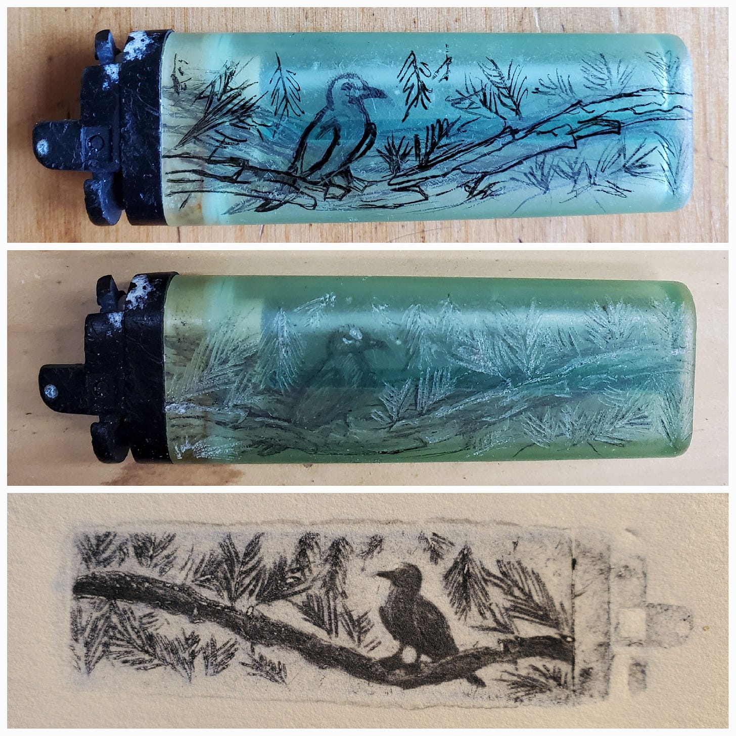 Albatross parents will fly for days to weeks, foraging for nutrient rich food to bring back and regurgitate for their chicks. Instead, they often unintentionally swallow floating plastic. These plastics compound in the stomach of the chicks, who cannot regurgitate the plastics until they are older, or not ever if the plastics are too large. Lighters—a single use item with an air pocket—are one of the most common things to find on Midway, nestled in the rib cages of feathery chick carcasses. I have hundreds of lighters that I collected while there, and I am turning them into collagraph/intaglio plates to depict scenes of my time on Midway. These lighters are suitable as plates because they have flat sides, which I suspect is a more common style of lighter in Asia, where most of the lighters come from due to the counterclockwise nature of the Pacific Ocean gyre. This series is an exception from my other work—which focuses more on Maine/Northeast US species and ecosystems—but served as a catalyst for this concept.