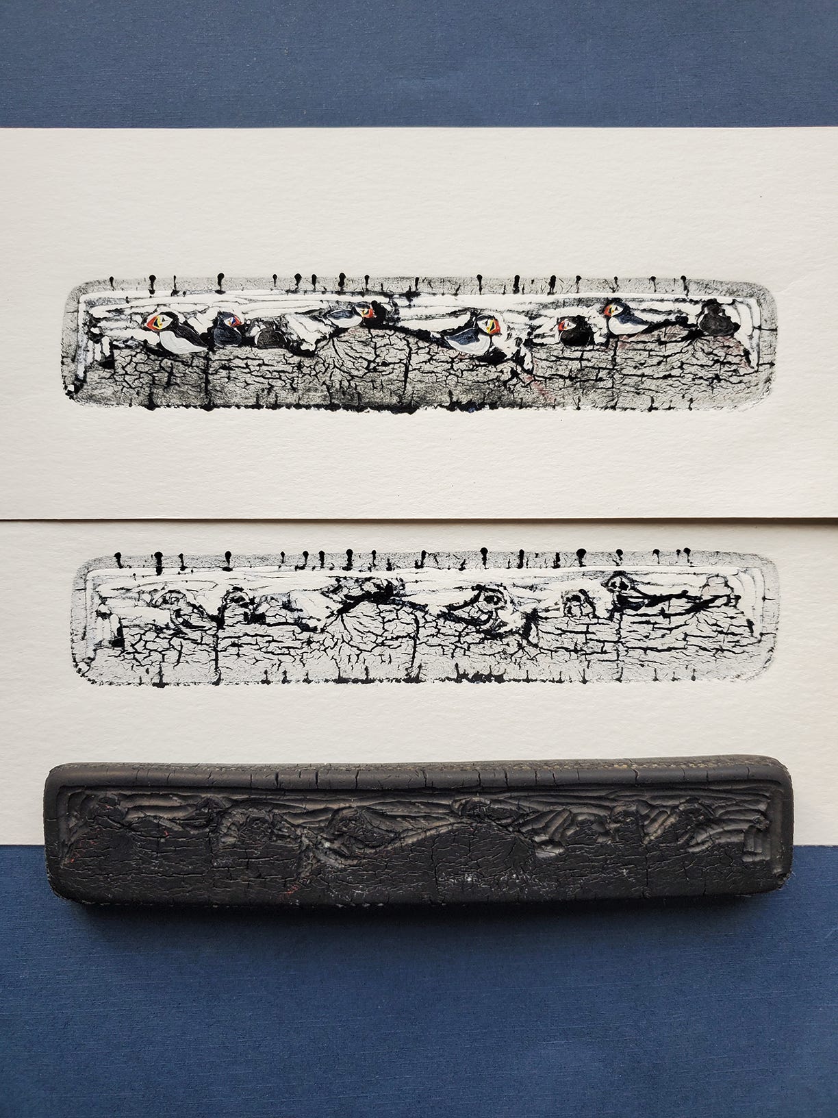 I am a non-toxic printmaker and field biologist with a passion for seabirds. I tend to spend my summers working as a researcher on remote islands in seabird colonies, and spend my off-season making art and working various jobs ranging from woodcarving to owl monitoring. As an example, I am currently (while writing this interview) on a dredging boat monitoring for endangered species!